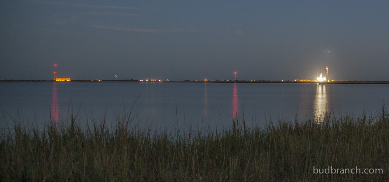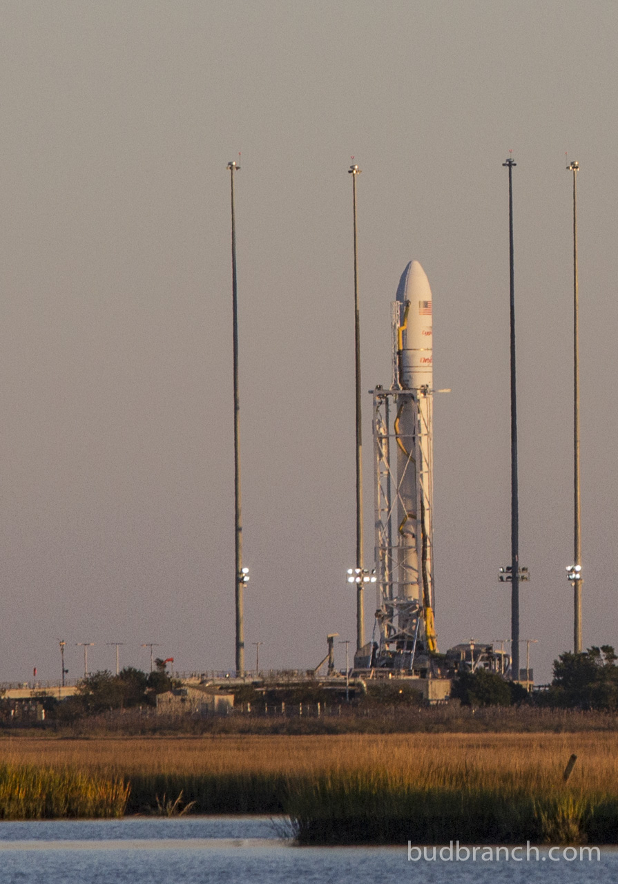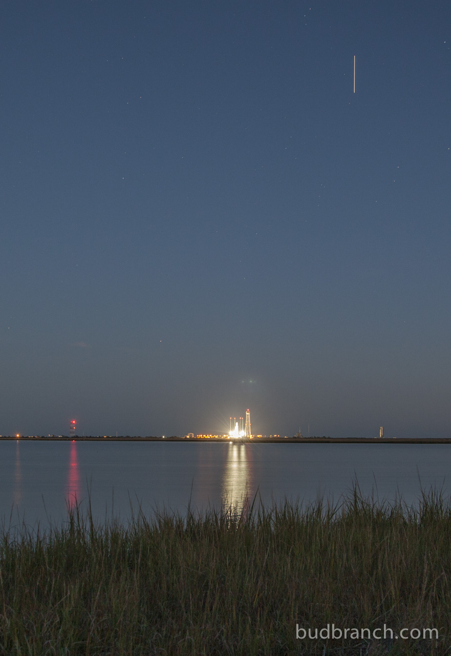 Monday’s launch attempt was scrubbed at the last minute due to a sailboat in the safety range area. This first photo (5sec exposure) includes the International Space Station passing over the launch pad, minutes after the scrub – no accident, as orbital geometry and physics demand that Antares’ launch is perfectly coordinated with the ISS orbit.
