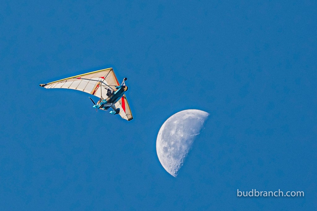I had gotten up early to make breakfast for camping guests when I got this text from my my pilot friend Chris – he wanted me to try to make a photo of his ultralight, composed with the Moon (clear morning, Moon high…). So I did: